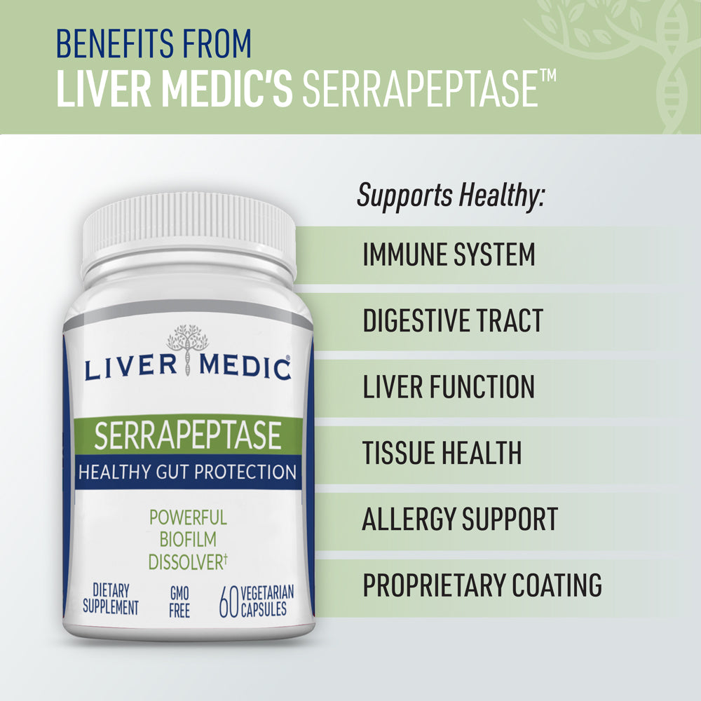SERRAPEPTASE is the strongest biofilm and scar tissue dissolving enzyme found in nature. Why would this be important in liver health? The liver replaces health cells with scar tissue when liver health deteriorates; removing this scar tissue will support liver health improvements. Removing biofilm is important, as biofilm forms an impenetrable shield providing a safe haven for viruses, harmful bacteria, candida, fungus and heavy metals in the gut. This significantly diminishes personal health. Our enteric-coated SERRAPEPTASE is designed for the safe, targeted reduction of biofilm.*SERRAPEPTASE is the leading biofilm dissolving enzyme available and the strongest enzyme found in nature. Serrapeptase is very important for those with gut issues and liver issues to incorporate this supplement in their health regimen.